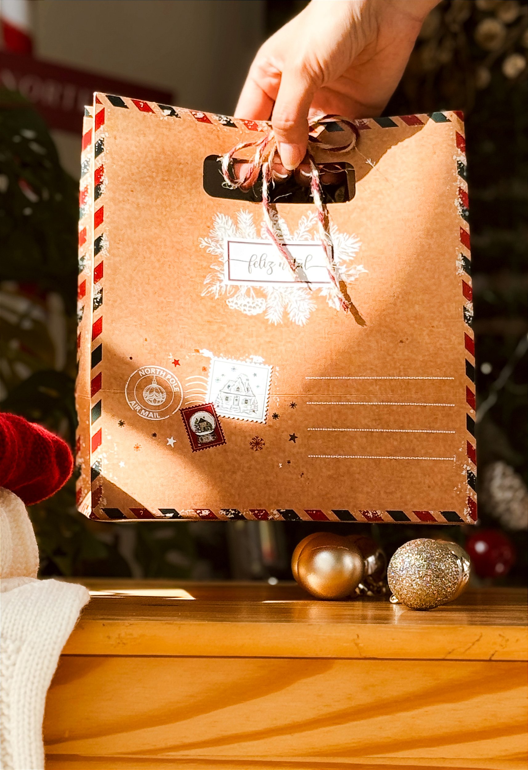 Com design inspirado em cartões postais do Polo Norte, ela combina estética kraft, selos ilustrados e detalhes festivos que trazem aquele clima acolhedor que todo presente merece.